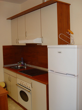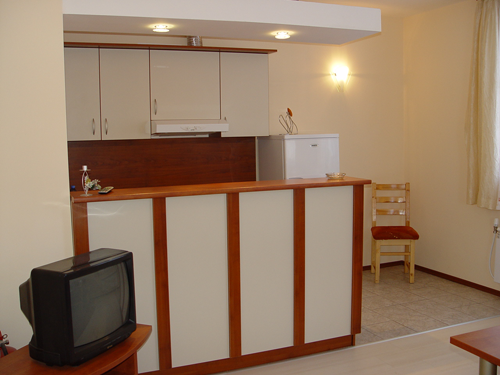 - кухненски бокс с хладилник, фурна, керамичен плот, прибори за хранене